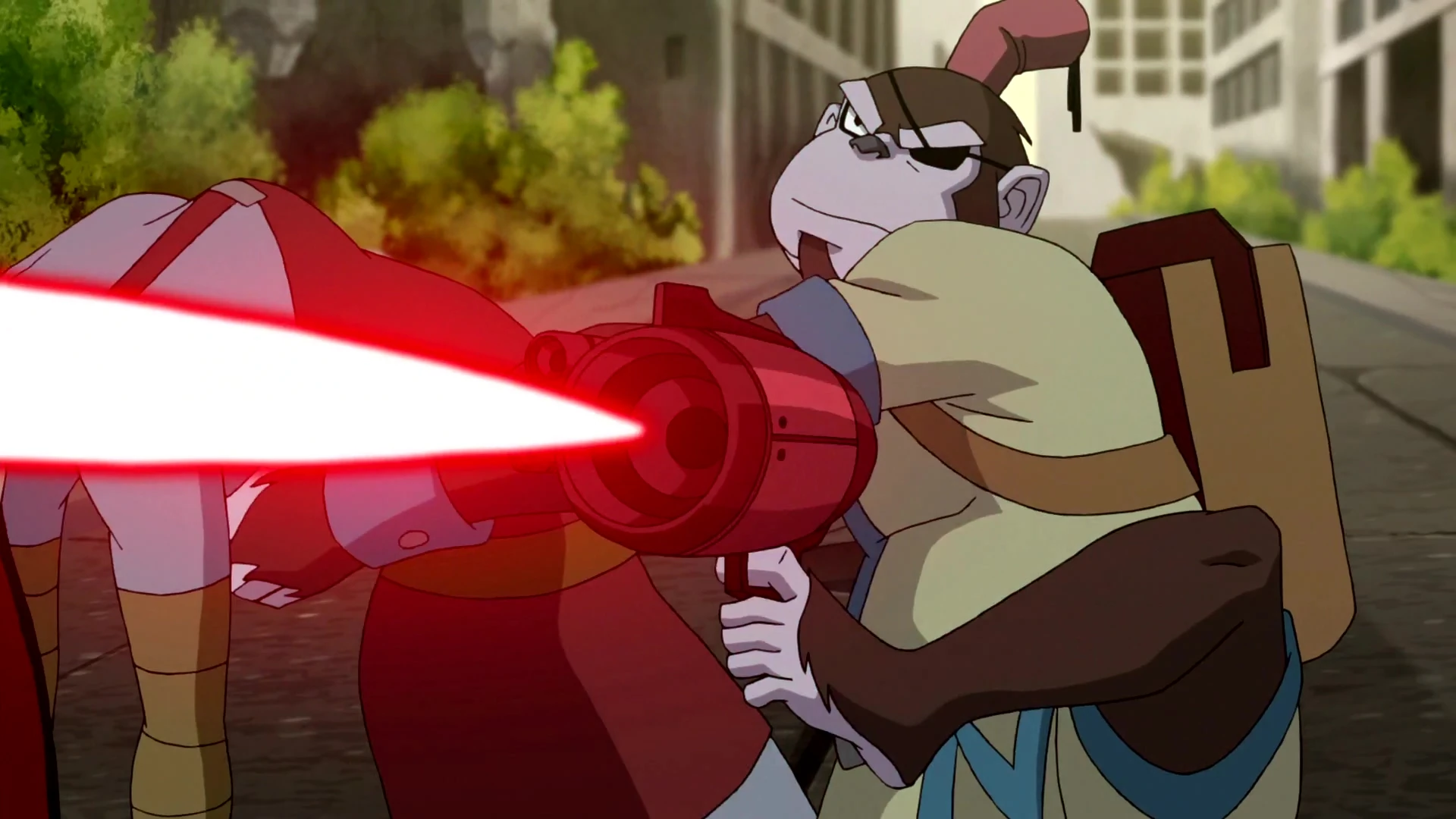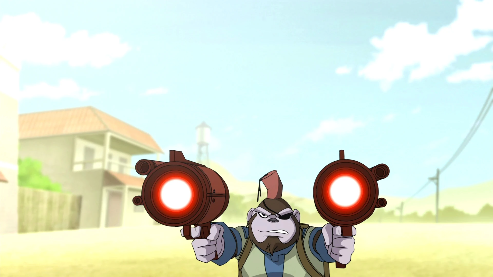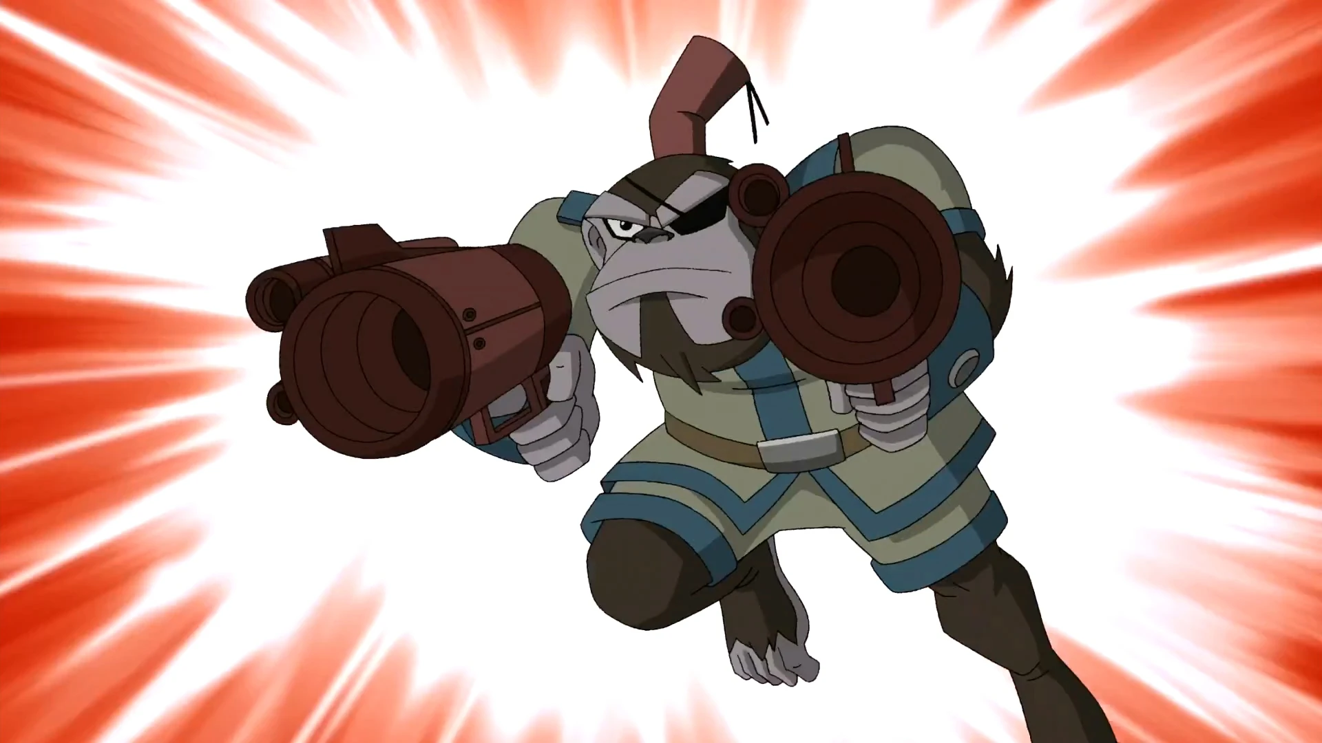 Bobo strzela energią z blasterów.