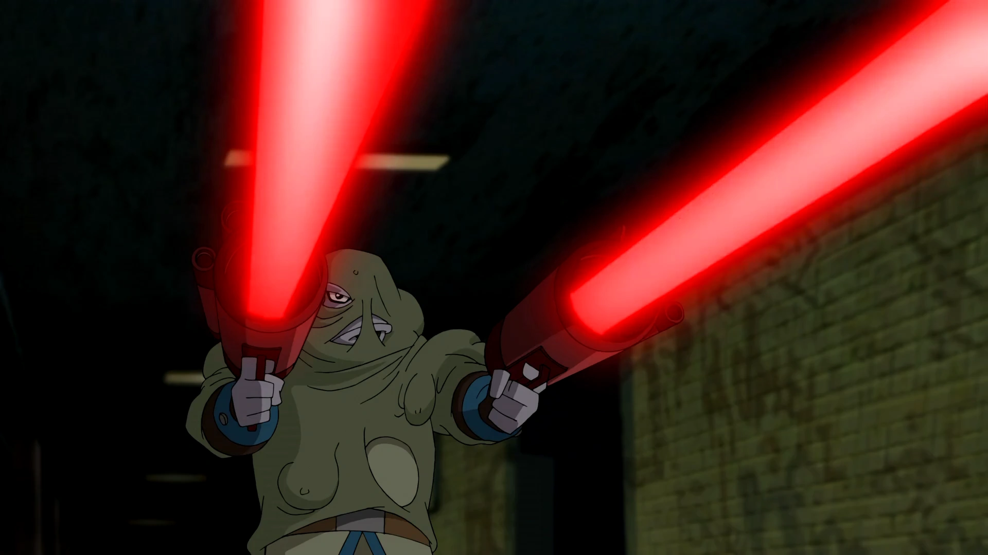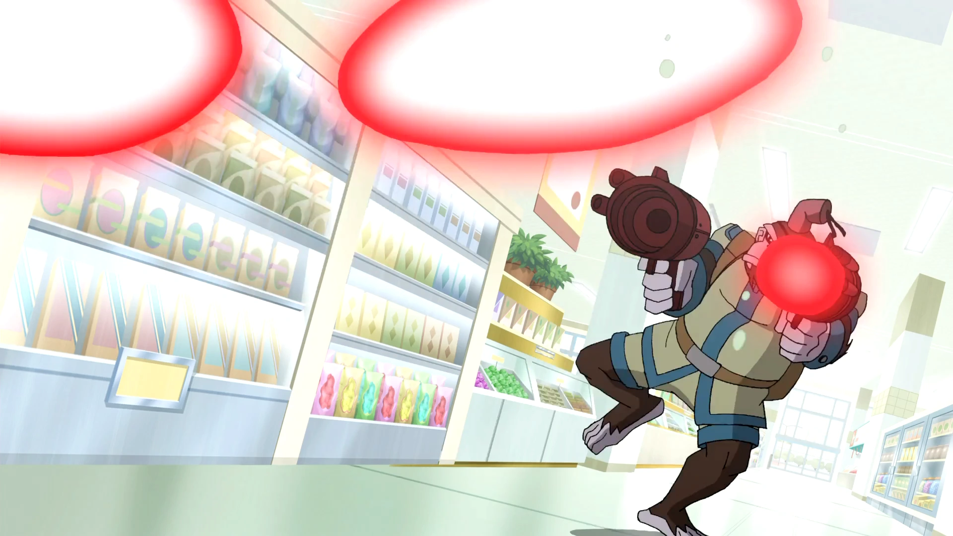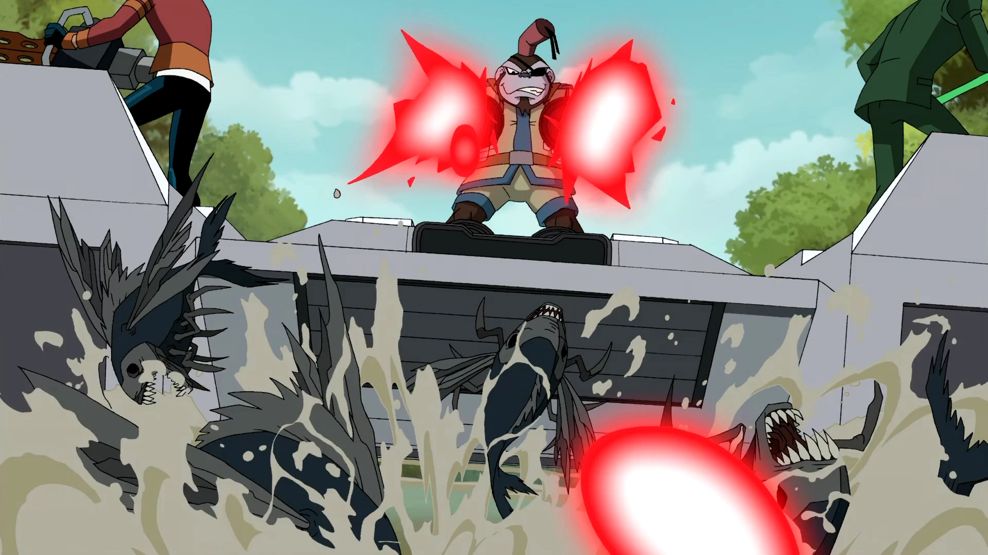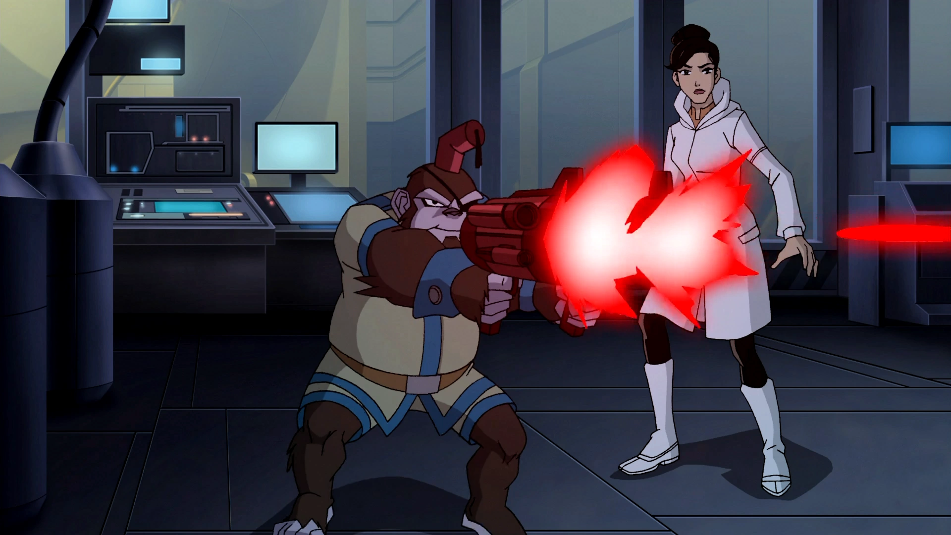 Bobo strzela energią z blasterów.