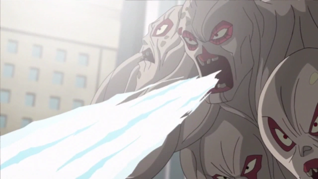 - Strzelanie mrożącym promieniem – Potworniak mógł strzelać z ust głów na swoim ciele zamrażającym promieniem[1].