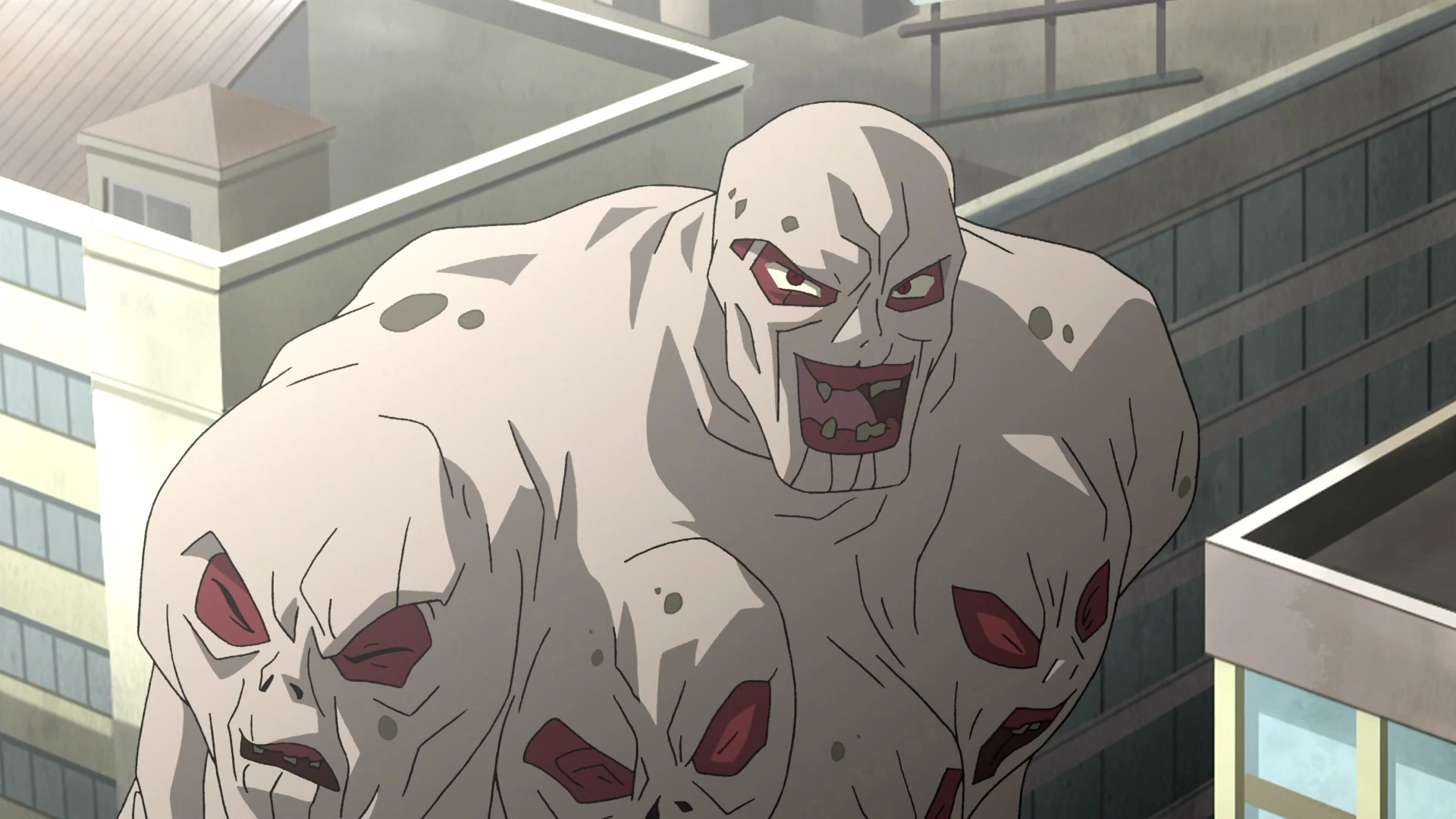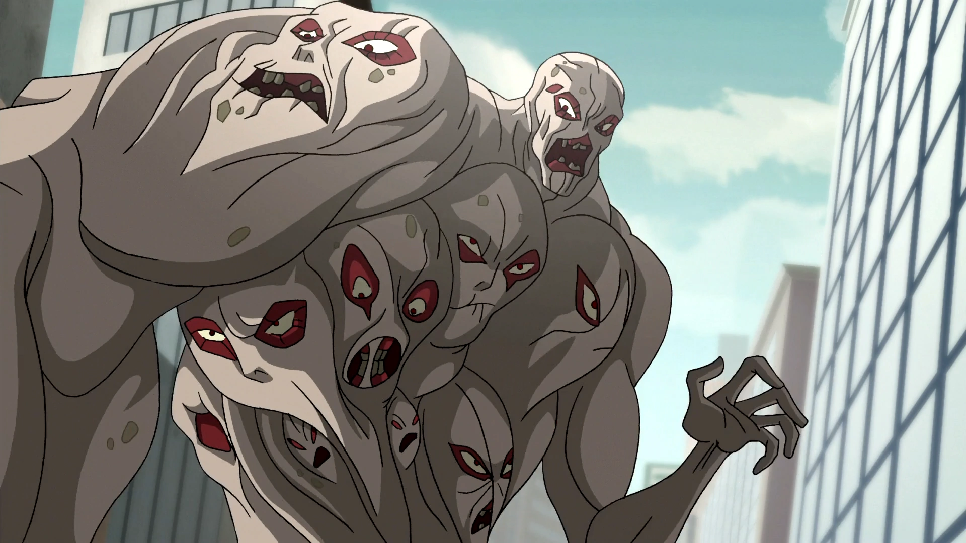 Mężczyzna, który zmutował z Potworniaka, w swojej E.V.O. formie był masywną bestią wielkości wieżowca. Na całym kremowo-szarym ciele kolosa widniało wiele głów z czerwonymi powiekami i szczęką bez zębów. Główna głowa umieszczona na szyi była łysa i mniejsza, a jej powieki miały taki sam kolor jak reszty. Potworniak posiadał cztery masywne nogi i muskularne ręce.